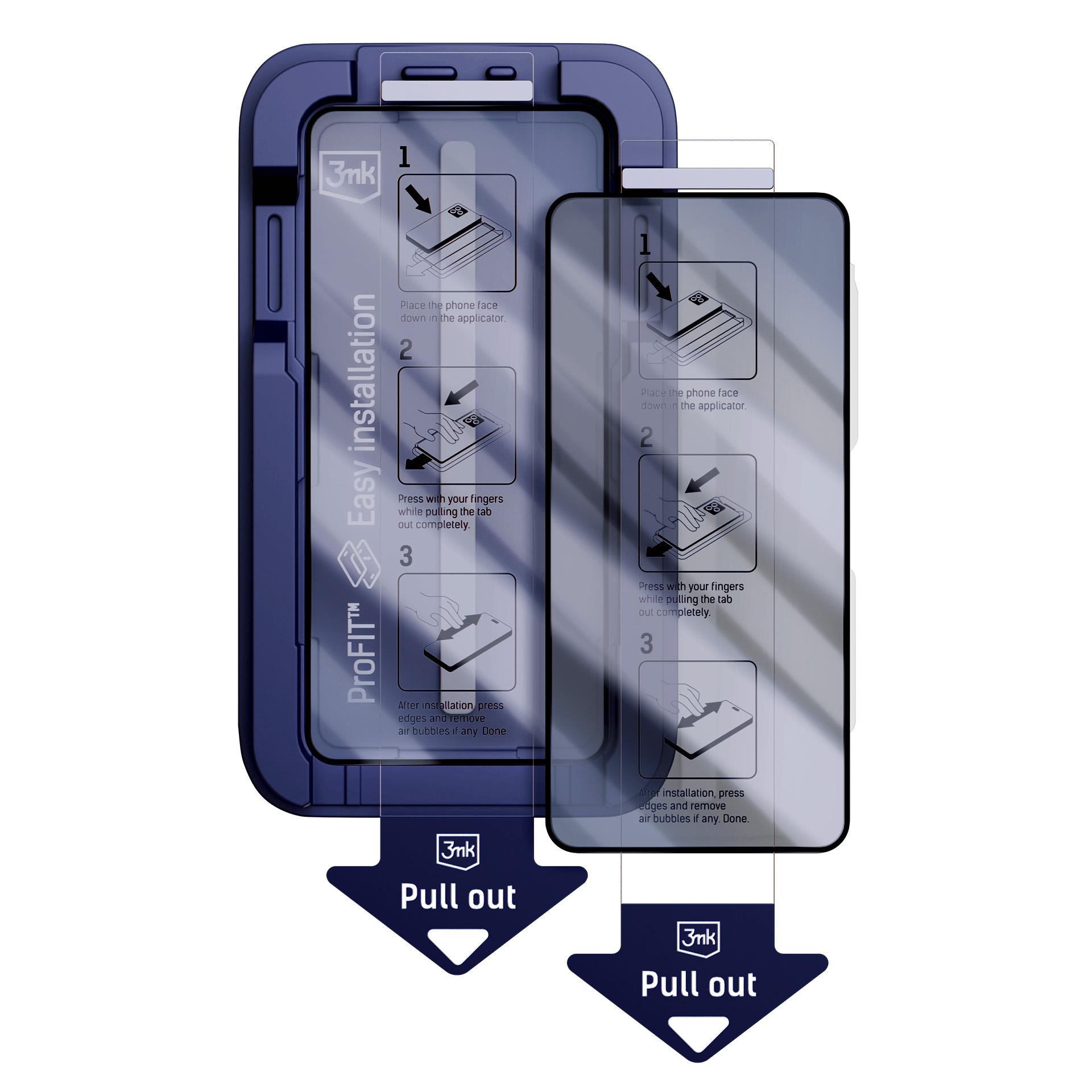 Grūdintas stiklas su privatumo funkcija apsaugo ekraną nuo pašalinių žvilgsnių jau nuo 28° kampo. Komplekte yra ProFIT™ aplikatorius, leidžiantis greitai ir tiksliai uždėti stiklą be burbuliukų ir dulkių. Rinkinyje yra 2 vnt. – vienas naudoti iš karto, kitas paliekamas atsargai.