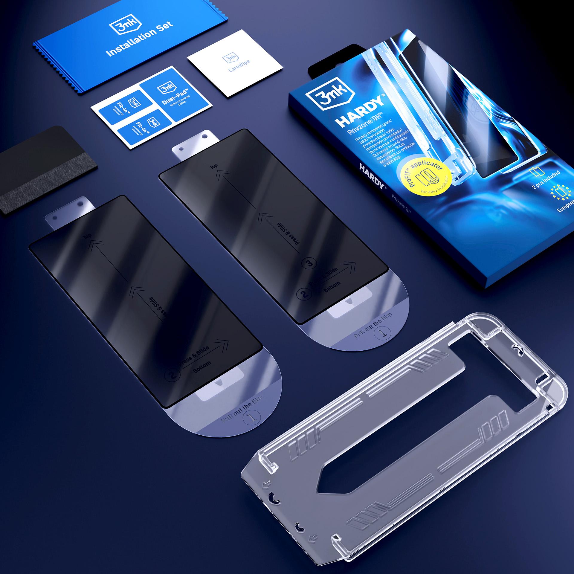 Grūdintas stiklas su privatumo funkcija apsaugo ekraną nuo pašalinių žvilgsnių jau nuo 28° kampo. Komplekte yra ProFIT™ aplikatorius, leidžiantis greitai ir tiksliai uždėti stiklą be burbuliukų ir dulkių. Rinkinyje yra 2 vnt. – vienas naudoti iš karto, kitas paliekamas atsargai.