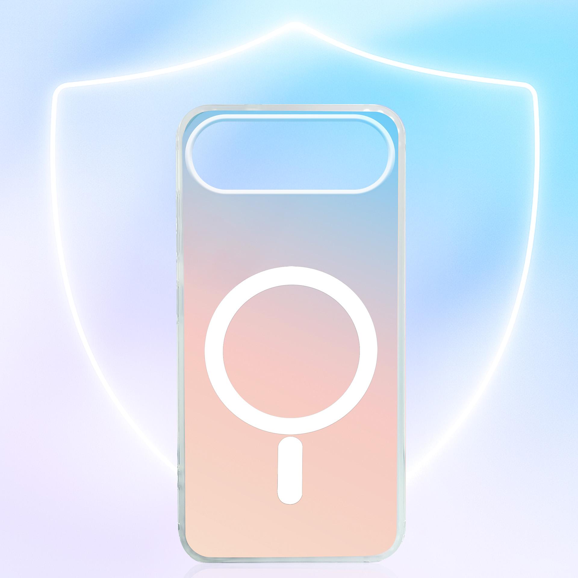 Holografinis dėklas su „MagSafe“, kuris keičia spalvas žiūrint iš bet kurio kampo. Sustiprinti kampai sugeria smūgius, pakelti kraštai apsaugo ekraną ir kamerą, o „Military Grade“ sertifikatas patvirtina atsparumą 26 kritimams be pažeidimų. Stilius ir apsauga be kompromisų.